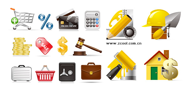 eps format, including jpg preview, keyword: Vector icons, shopping cart, percent, bank cards, credit cards, ATM cards, calculators, coins, sale, tag, money symbols, auction, hammer, suitcase , shopping basket, safe, briefcase, building, painting, house, shovel, pencil, safety helmets, ruler, vector material
